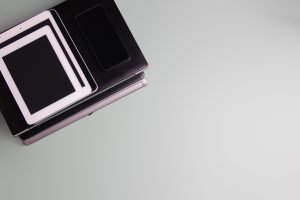 Pile of old used laptop computers, digital tablets, smartphones on gray background. Top view. Donation, e-waste, technology, online working, electronic waste for reuse, refurbish and recycle concept