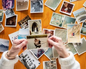 Top view of a senior caucasian woman looking at an old photos th
